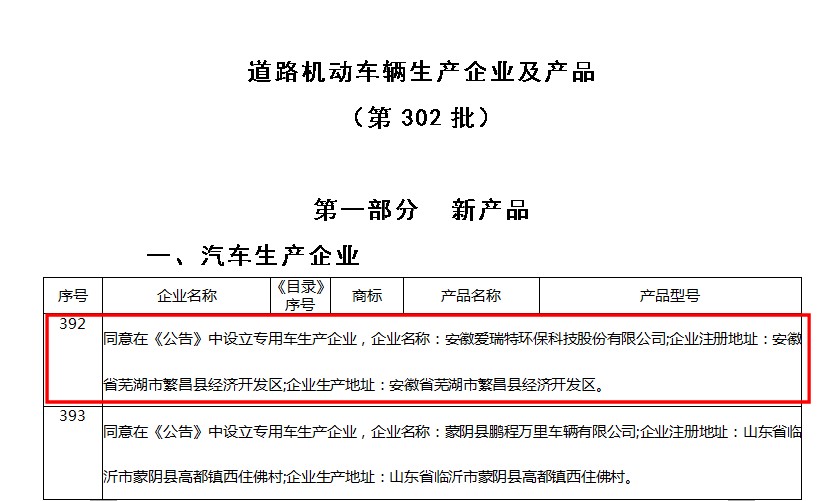 2017年獲國家工信部頒發(fā)“專用車生產(chǎn)資質(zhì)”愛瑞特產(chǎn)業(yè)園建成投產(chǎn);形成年產(chǎn)新能源環(huán)衛(wèi)車3萬臺、產(chǎn)能達(dá)20億規(guī)模專用汽車生產(chǎn)企業(yè);2018年公司正式更名為“安徽愛瑞特新能源專用汽車股份有限公司”